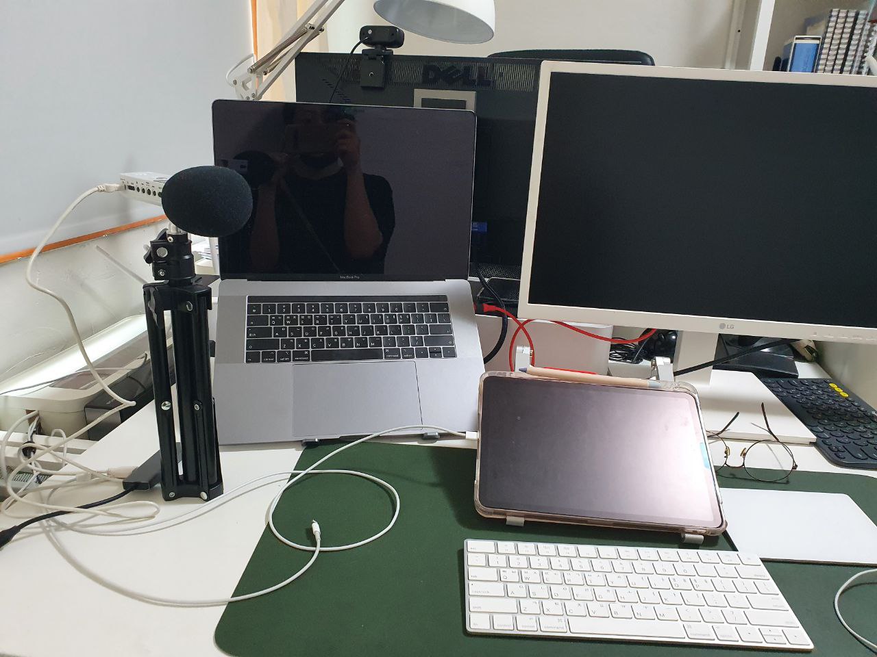 거의 방송하는 사람 셋팅 같은데 강의 수강 뿐 아니라 팀 프로젝트도 많이 하는데, 모두 온라인으로 이뤄지다 보니 이런 세팅을 갖춰놓고 공부했다.