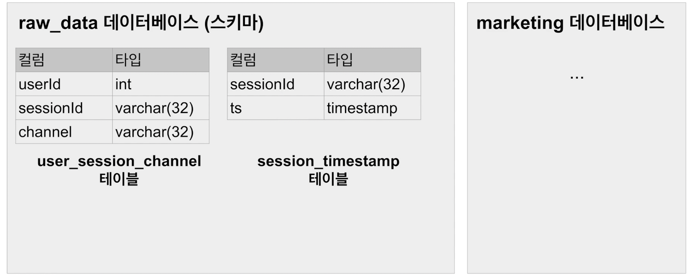 CREATE TABLE raw_data.user_session_channel( user int, sessionid varchar(32) primary key, -- uniqueness 보장 안됨 channel varchar(32) );