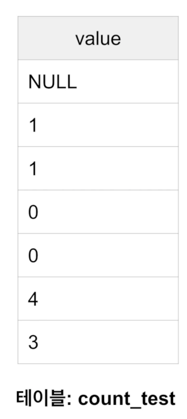 - SELECT COUNT(value) FROM count_test -> 6 (NULL 아닌 것만)