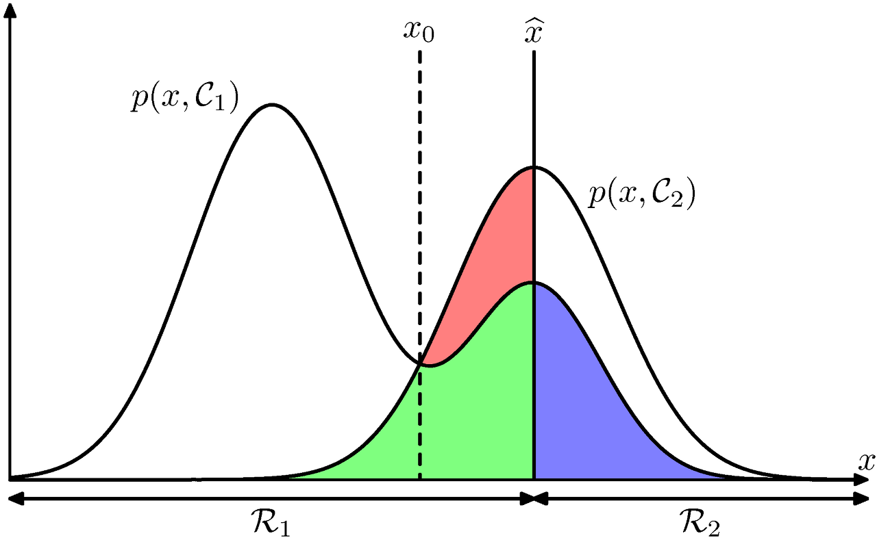 $p(mistake)=p(x\in R_1, C_2) + p(x\in R_2, C_1)=\int_{R_1}p({\bf x}, C_2)d{\bf x} + \int_{R_2}p({\bf x}, C_1)d{\bf x} \qquad$